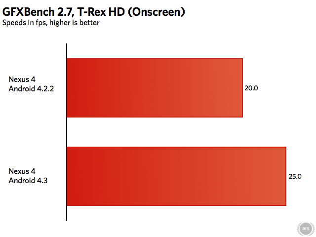 First, the good news: synthetic CPU and GPU benchmarks show that Android 4.3 has a measurable, consistent, positive impact on performance. The Geekbench number improves by about 16 percent overall compared to Android 4.2, and the GPU numbers improve by as much as 30 percent depending on the test you're running. The phone also feels more fluid and responsive—the Nexus 4 running Android 4.2 is no slouch, but animations and application launches are very snappy and fluid under the new operating system. The update certainly helps to close the performance gap we noticedbetween the Nexus 4's Snapdragon S4 Pro and the similar (but not identical) SoC in the 2013 Nexus 7.